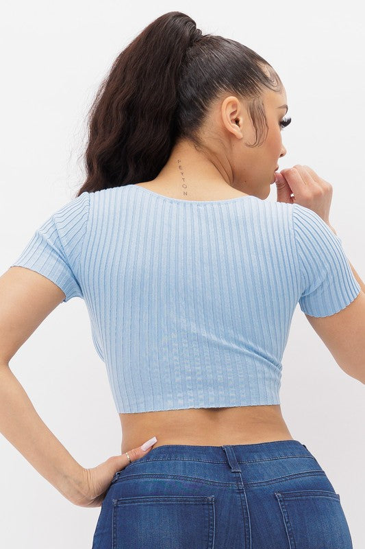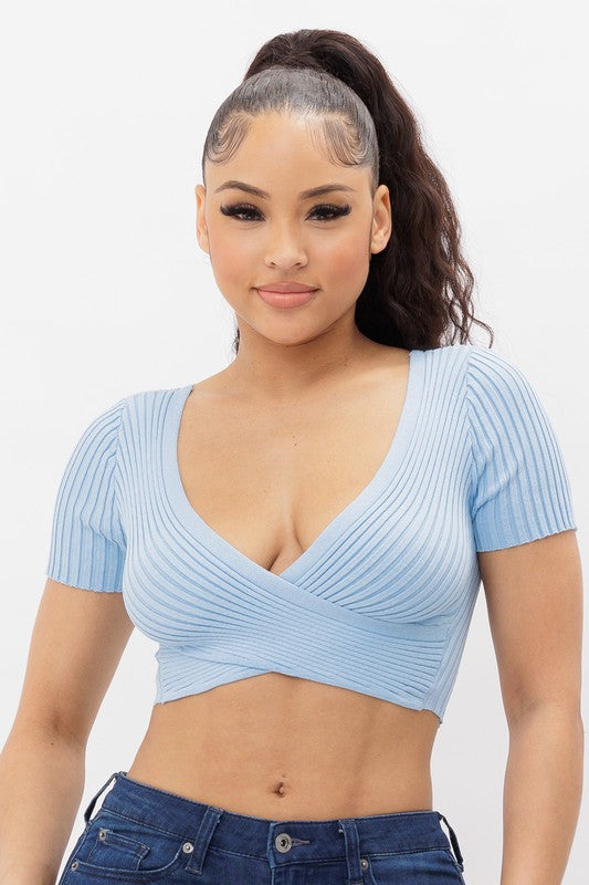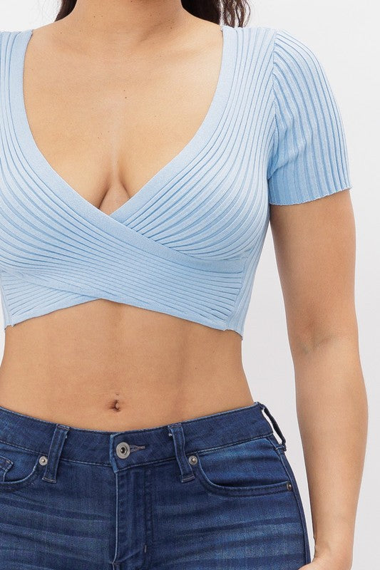 The Dia knit top has a front crossover plunging neckline and cap sleeve.